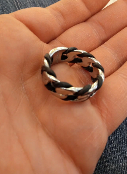 Кольцо с чёрно-белым переплетением, очень красиво выглядит, удобное в носке. Классный товар, я доволен.