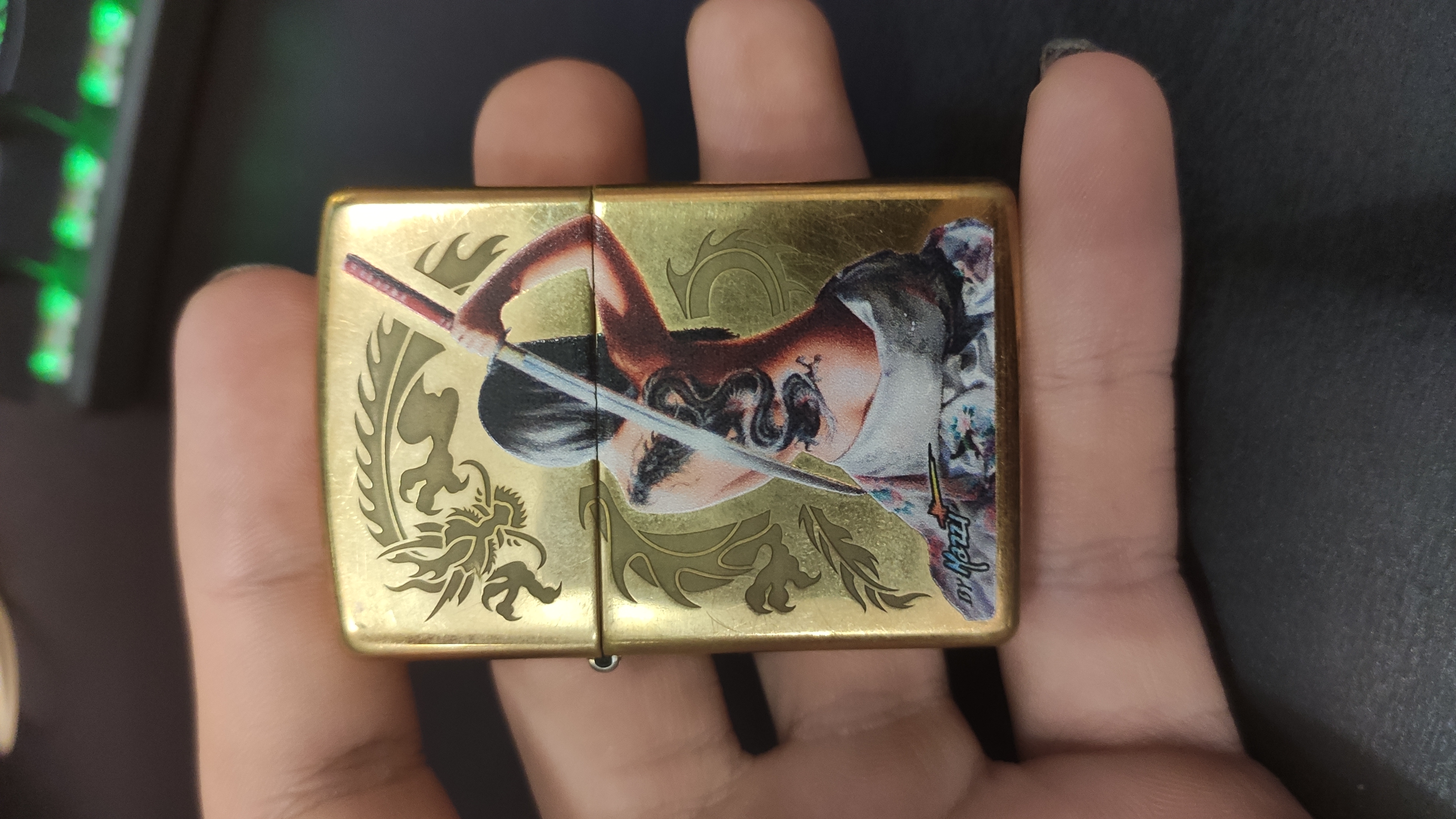 Для украшения лицевой поверхности этой зажигалки High Polish Brass использовались сразу две технологии. С помощью глянцевого травления в сочетании с цветным изображением вышел затейливый дракон и изящная дама с катаной. В комплект входит подарочная коробка. Для оптимальной работы рекомендуется заправлять оригинальным топливом Zippo.